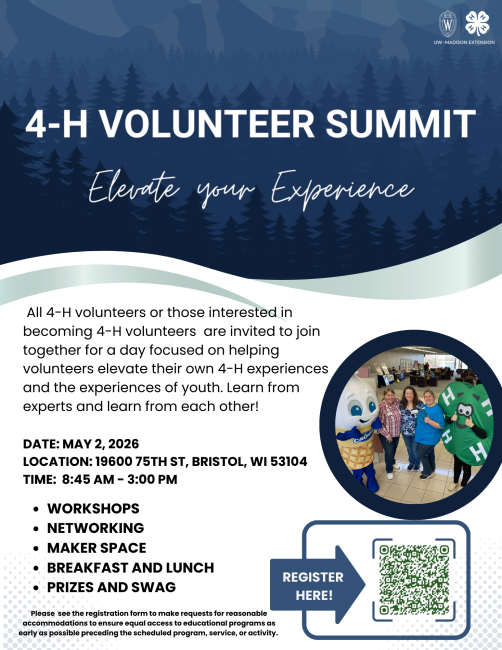 Elevate your volunteering experience and join us on May 2nd at the Kenosha County Center for the 2026 4-H Volunteer Summit.