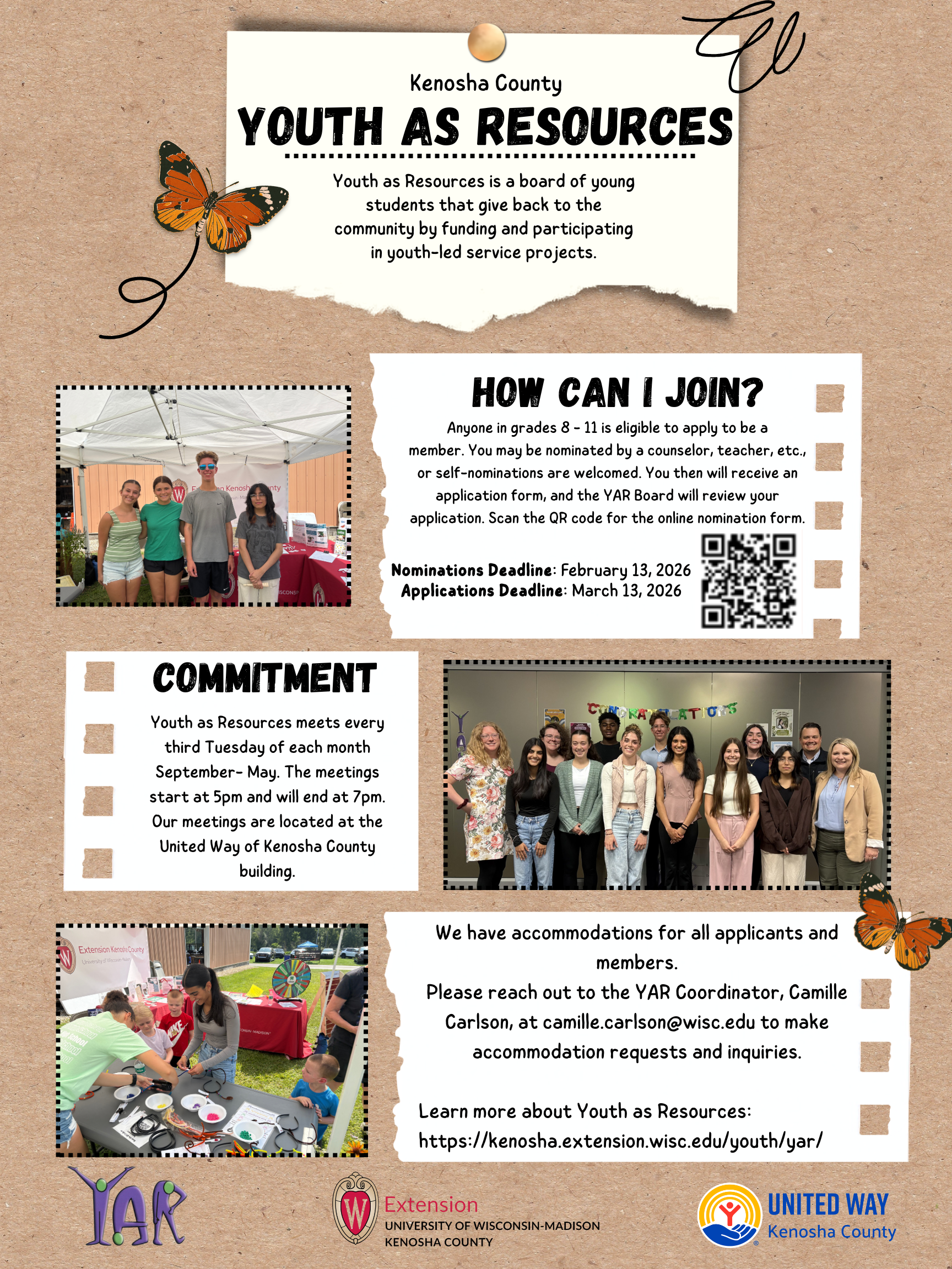 The YAR Board is committed to fostering an accessible space for all youth or adults interested in a Board position and making sure that everyone who attends a YAR meeting can fully participate in ways that are meaningful to them. An elevator is available, and the meeting room is wheelchair-accessible. For any accommodation requests, please contact Camille Carlson at camille.carlson@wisc.edu or call the Extension Kenosha County office at 262-857-1945.